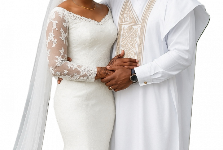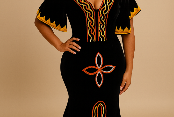 This striking Cameroonian gown blends modern elegance with cultural richness. Crafted from luxurious black velvet, the fitted mermaid silhouette is elevated by bold puff sleeves and a dramatic floor-sweeping hemline edged with intricate orange embroidery. A central embroidered motif adds heritage detail.