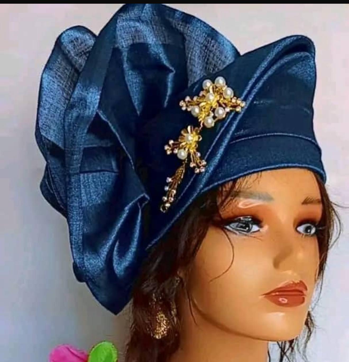 This beautifully crafted gele is styled in luxurious fabric, artistically folded into a voluminous and regal silhouette. Adorned with intricate pearl and gold embellishments on the side, it exudes sophistication and timeless elegance.