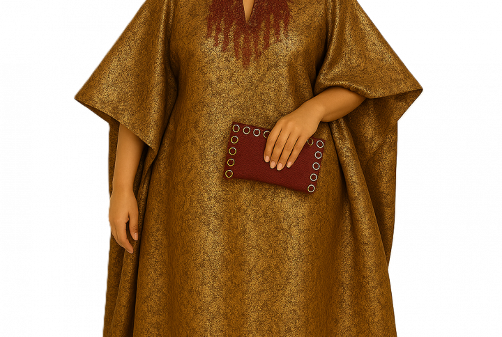 This breathtaking couple’s outfit is the definition of royalty and cultural prestige. The woman commands attention in a floor-sweeping mermaid gown, crafted from luxurious Ankara fabric in deep burgundy and teal hues, with bold floral and swirl patterns. The dramatic puff sleeves, figure-hugging cut, and matching headwrap radiate elegance, while intricate teal lace embroidery along the neckline adds a touch of sophistication.