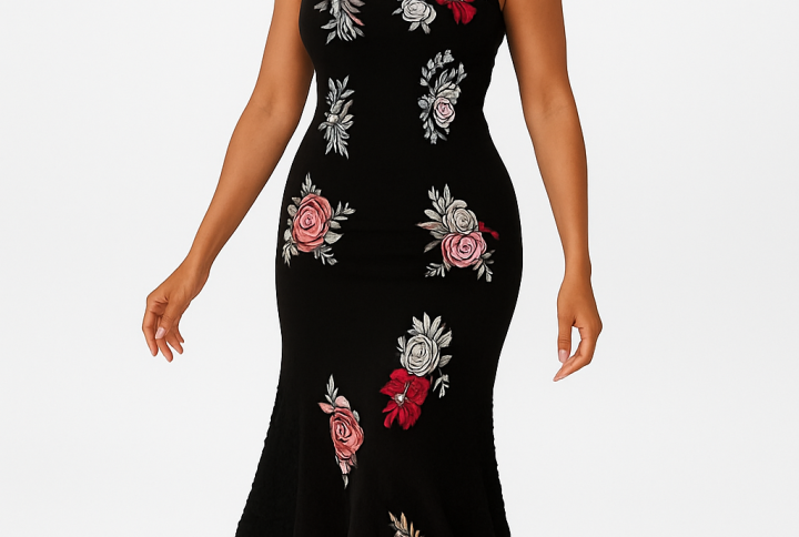 Design: Fully beaded mermaid gown with bold ruffle shoulders