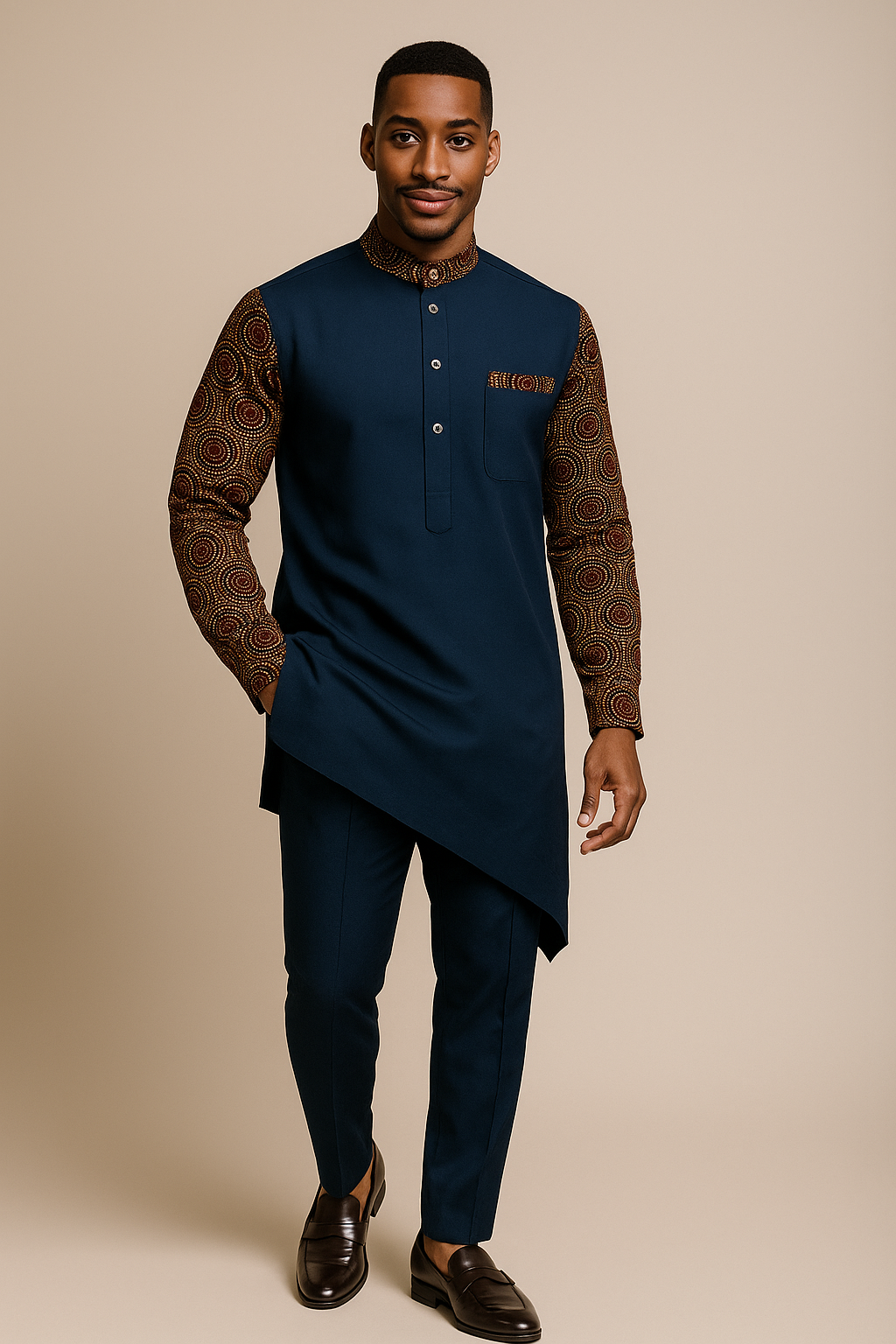 The Senator Suit is a symbol of elegance, authority, and cultural pride. The design features a long tailored tunic with a clean, modern cut paired with fitted trousers for a sharp and confident look. Subtle Ankara details on the sleeves, collar, and pocket add a touch of artistry that makes the suit both unique and timeless.